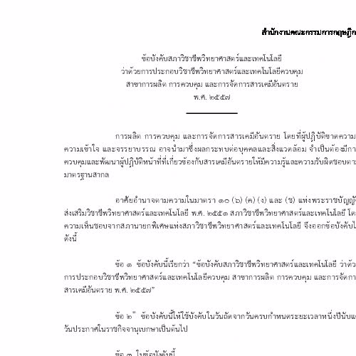 "ข้อบังคับสภาวิชาชีพวิทยาศาสตร์และเทคโนโลยีว่าด้วยการประกอบวิชาชีพวิทยาศาสตร์และเทคโนโลยีควบคุมสาขาการผลิต การควบคุม และการจัดการเคมีอันตราย พ.ศ.2557".