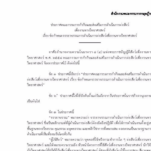 "ประกาศคณะกรรมการกำกับและส่งเสริมการดำเนินการต่อสัตว์เพื่องานทางวิทยาศาสตร์ เรื่อง ข้อกำหนกจรรยาบรรณการดำเนินการต่อสัตว์เพื่องานทางวิทยาศาสตร์".