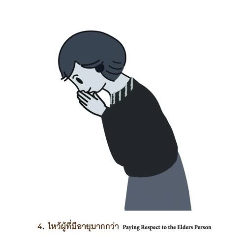 | คำอธิบาย : 4. ไหว้ผู้ที่มีอายุมากกว่า ประนมมือขึ้น ก้มศีรษะ ค้อมหลังพอประมาณให้นิ้วหัวแม่มือ จรดปลายคาง นิ้วชี้จรดปลายจมูก |
