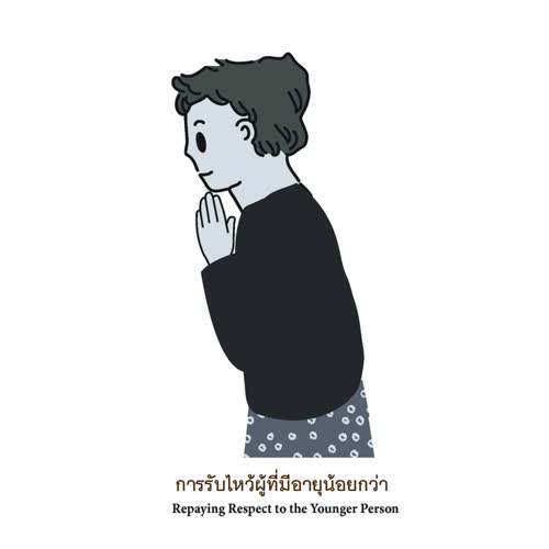 | คำอธิบาย : การรับไหว้ผู้ที่มีอายุน้อยกว่า ประนมมือแล้วยกขึ้นเล็กน้อย ก้มศีรษะเล็กน้อย ให้มือชิดอยู่ที่หน้าอก ปลายนิ้วชี้อาจอยู่ที่ปลายคาง |