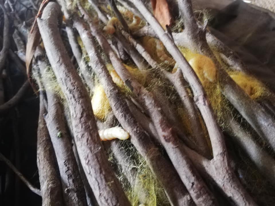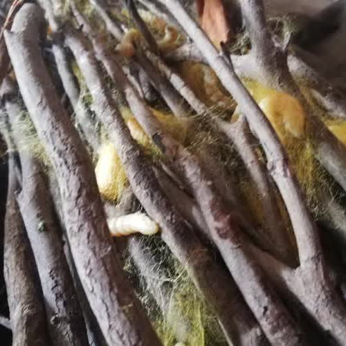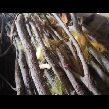 | คำอธิบาย : หนอนไหมกำลังปล่อยเส้นใยไหมห่อตัวเองเป็นรังไหม |