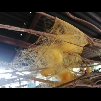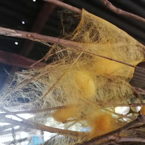 | คำอธิบาย : หนอนไหมกำลังปล่อยเส้นใยไหมห่อตัวเองเป็นรังไหม |