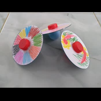 | คำอธิบาย : ลูกข่างซีดีเป็นสื่อเรียนรู้เรื่องพลังงานจลน์แบบที่สามารถทำเองได้ง่ายๆ โดยมีอุปกรณ์ดังนี้ 1) แผ่นซีดีเก่า 2) ลูกปิงปอง 3) ฝาขวดน้ำดื่มพลาสติก 4) กาวยาง 5) กระดาษ (ระบายสีตกแต่งบนแผ่นซีดี) และ 6) ดินสอสี ซึ่งพลังงานจลน์เกิดขึ้นจากการเคลื่อนที่แบบหมุนของวัตถุในแนวตั้งฉาก แรงจากการหมุนตัวของลูกข่างที่คงที่เกิดเป็นแรงเฉื่อย |