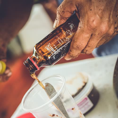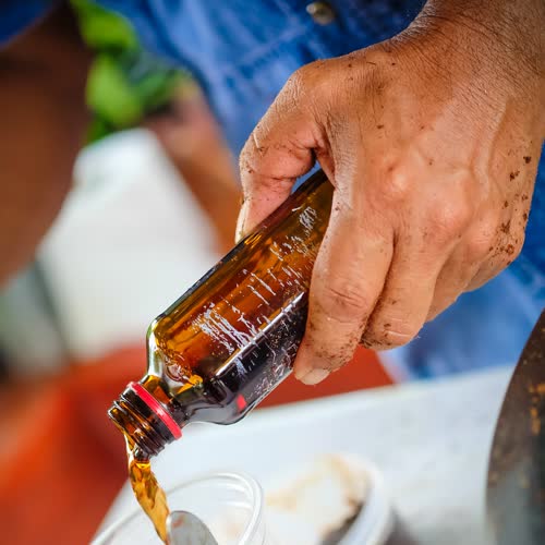 ใส่เครื่องดื่มบำรุงกำลังไปในแก้วที่มีกะปิ