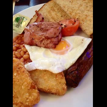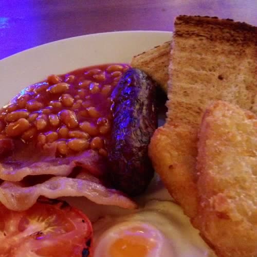 | คำอธิบาย : อาหารเช้าสไลต์อังกฤษ (English traditional breakfast) มักประกอบด้วย ไข่ดาว เบคอน ไส้กรอก มะเขือเทศย่าง ขนมปังปิ้ง และถั่วอบซอสมะเขือเทศ (baked beans) |