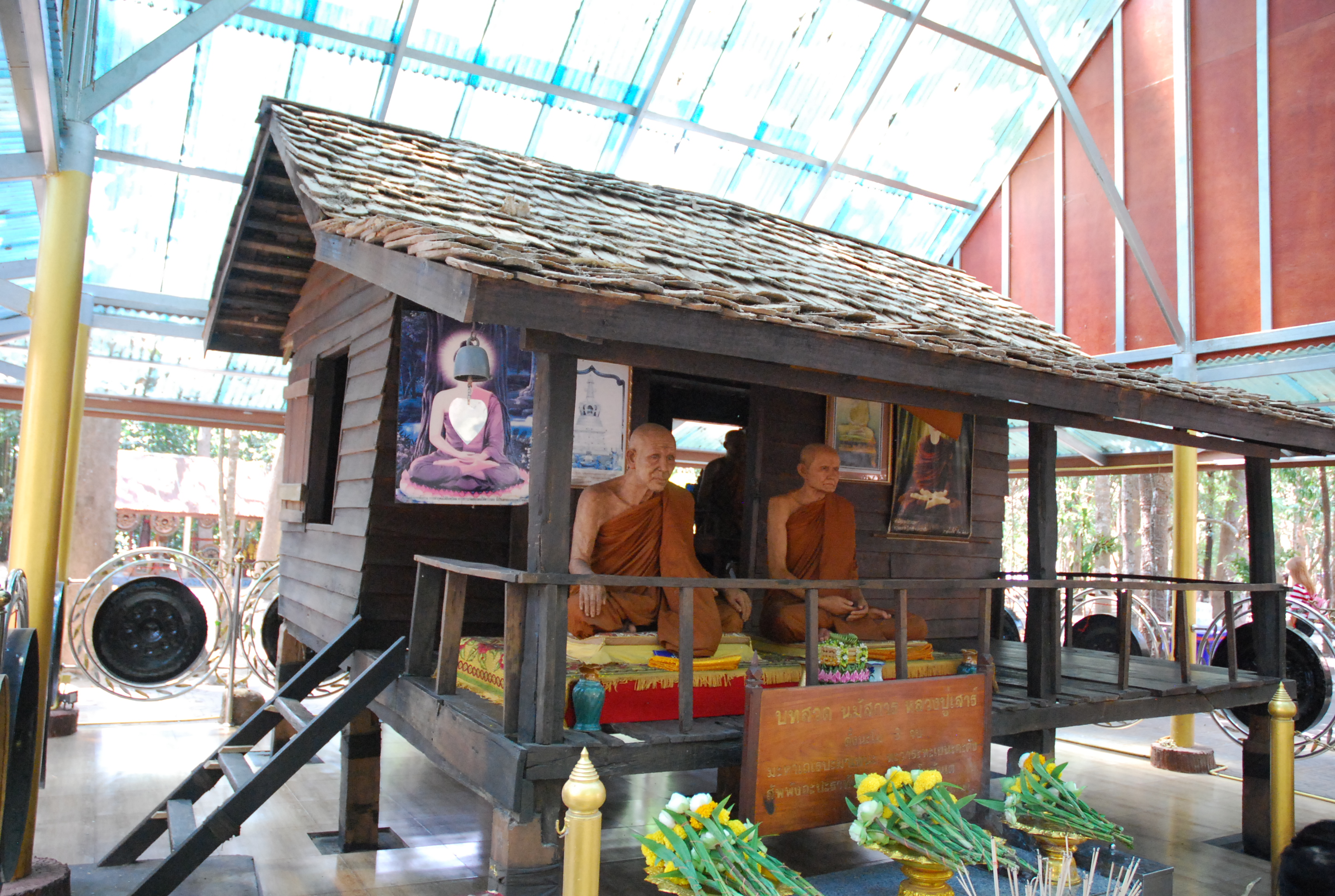 คำอธิบาย : วัดดอนธาตุ อำเภอพิบูลมังสาหาร จังหวัดอุบลราชธานี ตั้งอยู่บนเกาะกลางแม่น้ำมูล เป็นสถานที่พระครูวิเวกพุทธกิจ (เสาร์ กันตสีโล) และพระอาจารย์ดี ฉันทโร (วัดภูเขาแก้ว) ได้จาริกมาปักกลดกรรมฐานหาที่ดินที่เหมาะสมสำหรับก่อสร้างวัดวิปัสสนากรรมฐาน ปัจจุบันยังคงปรากฏเวชนียสถานและอัฐบริขารของท่าน เช่น กุฎิไม้ที่ท่านเคยจำพรรษา แท่นหินสำหรับนั่งสมาธิภาวนา ทางเดินจงกรม อัฐบริขารและเครื่องใช้ส่วนตัวของท่าน เช่น สังฆาฏิ ผ้าปูนั่ง กาน้ำ จัดแสดงไว้ในเจดีย์ที่สร้างขึ้นเพื่อเป็นอนุสรณ์สถานให้พุทธศาสนิกชนได้กราบไหว้บูชาเป็นที่ยึดหนี่ยวจิตใจ และจารึกไว้ให้ได้ศึกษาจริยวัตรและแนวทางในการปฏิบัติของพระอาจารย์เสาร์ กันตสีโล |