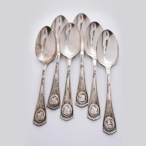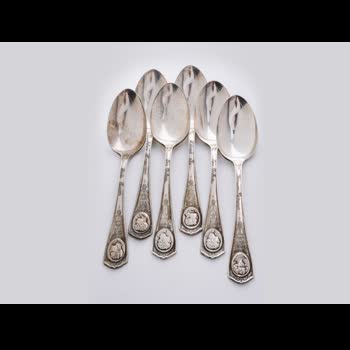 | คำอธิบาย : ของที่ระลึกจากภาพยนตร์จัดทำเป็นชุดช้อนเงิน ปลายช้อนปั๊มนูนรูปใบหน้าดาราภาพยนตร์ที่โด่งดังในยุคหนังเงียบช่วงคริสต์ศตวรรษที่ 20 พร้อมลายเซ็น |