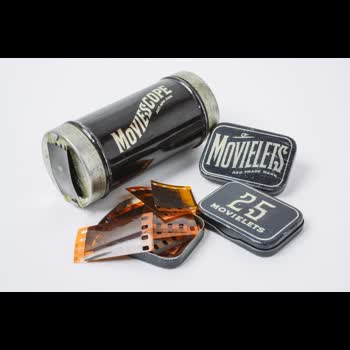 | คำอธิบาย : ในยุคที่มหรสพภาพยนตร์เป็นที่นิยมอย่างยิ่ง เด็ก ๆ จะวนเวียนอยู่ตามห้องฉายหรือสายหนังเพื่อคอยเก็บเศษฟิล์มที่เขาตัดทิ้งเอามาส่องดูได้ทั้งวัน มูฟวี่สโคปนี้เป็นของเล่นที่จัดทำอย่างครบชุดมีกระบอกสำหรับส่องดูฟิล์มและกลักที่บรรจุเศษฟิล์มมาพร้อมสรรพ จัดทำไว้เป็นชุดขายสำหรับคนมีตังค์ |