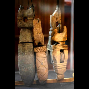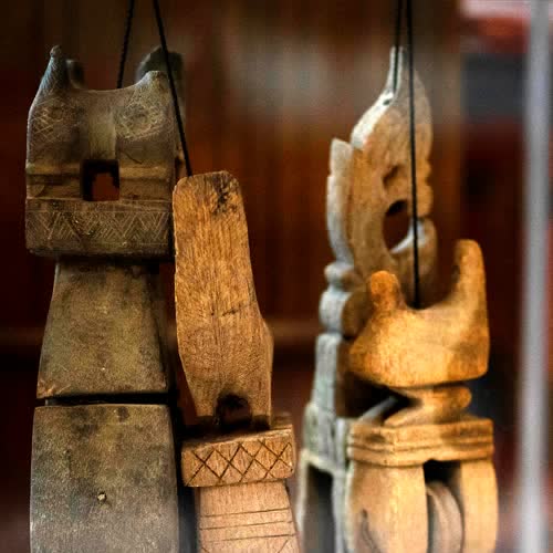 | คำอธิบาย : โครงหม่าล้อ คือ อุปกรณ์การทอผ้า เป็นโครงครอบลูกรอกสำหรับโยงกับฟืมทอผ้า ทำด้วยทองเหลือ สัมฤทธิ์ หรือ ไม้ นิยมทำเป็นรูป กินร สิงห์ นก ช้าง ม้า ฯลฯ |