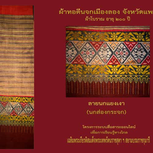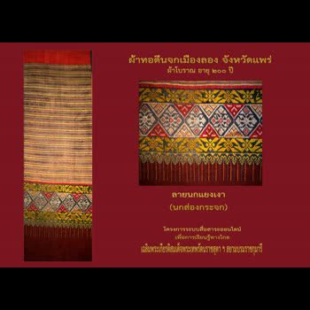 | คำสำคัญ : เมืองลอง, แพร่, ประเพณี, หัตถศิลป์, ความเชื่อ, ผ้าซิ่นตีนจก, ทอผ้า, ขนบธรรมเนียม, ผ้าซิ่น, ลายผ้า, พวนหาดเสี้ยว, งานบุญ, โกมลผ้าโบราณ, ลายผ้าซิ่น, ลายนกแยงเงา (นกส่องกระจก), ผ้าโบราณ |