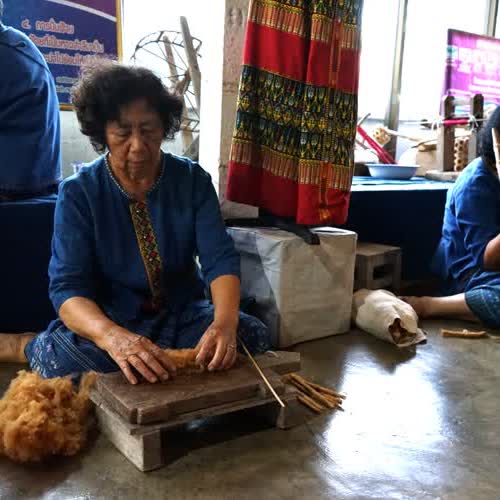 | คำอธิบาย : เป็นการนำฝ้ายฟูมาม้วนเป็นหางสำลี เพื่อจะนำไปปั่นเป็นเส้นฝ้ายต่อไป |