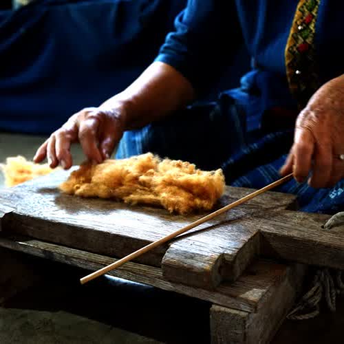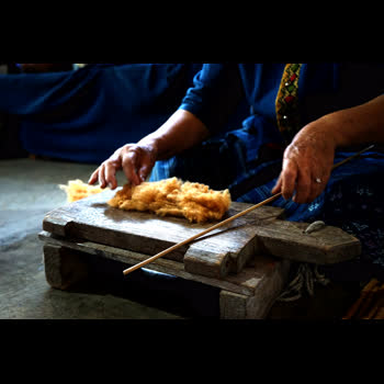 | คำอธิบาย : เป็นการนำฝ้ายฟูมาม้วนเป็นหางสำลี เพื่อจะนำไปปั่นเป็นเส้นฝ้ายต่อไป |