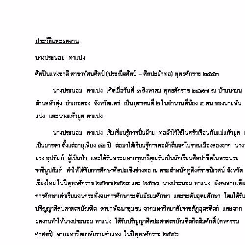 | ชื่อเรื่อง : ประวัติและผลงาน นางประนอม ทาแปง |
