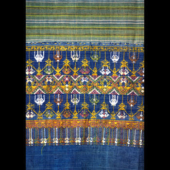 | คำอธิบาย : ผ้าทอตีนจกเมืองลอง จังหวัดแพร่ ลวดลายของศิลปินแห่งชาติ ประนอม ทาแปง ซิ่นต๋าต่อจกโบราณฝ้ายปั่นมือย้อมคราม ลายขันดอก |