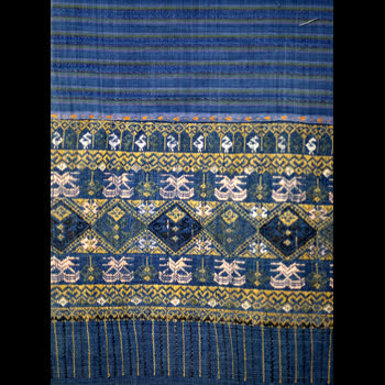 | คำอธิบาย : ผ้าทอตีนจกเมืองลอง จังหวัดแพร่ ลวดลายของศิลปินแห่งชาติ ประนอม ทาแปง ซิ่นต๋าต่อจกโบราณฝ้ายปั่นมือย้อมคราม ลายหงส์คู่ , ขากำปุ้ง |
