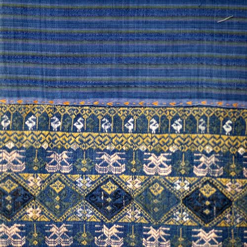 ผ้าทอตีนจก เมืองลอง จังหวัดแพร่ ซิ่นต๋าต่อจกโบราณฝ้ายปั่นมือย้อมคราม ลายหงส์คู่ , ขากำปุ้ง ได้รับใบอนุญาตภายใต้ ให้เผยแพร่-โดยต้องระบุที่มาแต่ห้ามดัดแปลงและห้ามใช้เพื่อการค้า 3.0 Thailand.