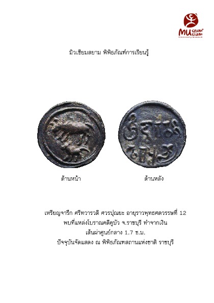 | คำอธิบาย : เหรียญเงินจารึกอักษรปัลละ ภาษาสันสกฤตอ่านว่า "ศรีทวารวดี ศวรปุณยะ" การค้นพบเหรียญนี้จึงเป็นหลักฐานยืนยันว่ารัฐทวารวดีมีอยู่จริง และเป็นรัฐที่มีกษัตริย์ปกครอง |