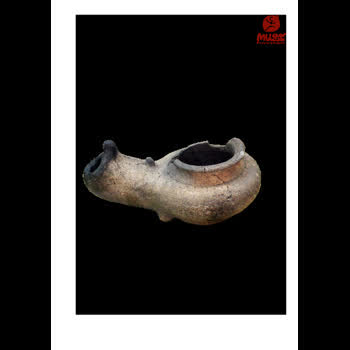 | คำอธิบาย : ตะเกียงดินเผาสมัยทวารวดี รูปทรงคล้ายตะเกียงสำริดโรมันซึ่งชาวทวารวดีอาจได้รับอิทธิพลมาจากชาวโรมันที่เข้ามาค้าขายโดยตรง หรือผ่านทางพ่อค้าชาวอินเดีย ตะเกียงรูปทรงนี้ใช้ในครัวเรือนทั่วไป และผลิตขึ้นเองในชุมชนเพราะมีการค้นพบลานดินสำหรับเผาภาชนะกลางแจ้งหลายแห่ง |
