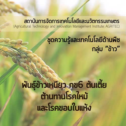| ชื่อเรื่อง : epub ชุดความรู้และเทคโนโลยี พันธุ์ข้าวเหนียว กข6 ต้นเตี้ย ต้านทานโรคไหม้ และโรคขอบใบแห้ง |