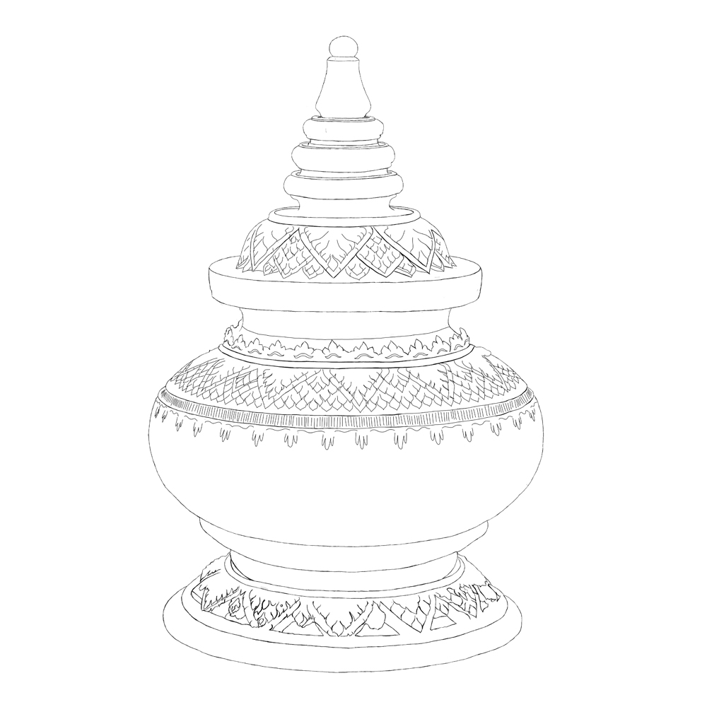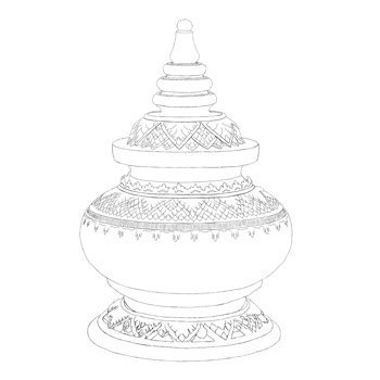 | คำอธิบาย : ภาพวาดภาชนะเครื่องปั้นดินเผา รูปหม้อน้ำลายวิจิตรเป็นเครื่องปั้นดินเผาลักษณะเฉพาะพิเศษของชาวมอญบ้านเกาะเกร็ด จ.นนทบุรี หม้น้ำลายวิจิตรทำขึ้นเพื่อถวายพระสงฆ์ |