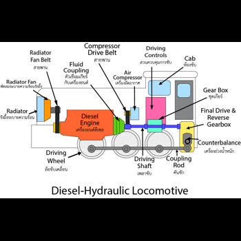| คำอธิบาย : รถจักรดีเซลไฮดรอลิก Diesel-Hydraulic Locomotive คือ รถจักรที่ใช้เครื่องยนต์ดีเซล เป็นเครื่องต้นกำลัง และมีเครื่องอุปกรณ์ สำหรับส่งหรือถ่ายกำลังจากเครื่องยนต์ ไปหมุนล้อ เพื่อขับเคลื่อนตัวเองและลากจูงรถพ่วง ซึ่งประกอบไปด้วย Rediator Fan Belt (สายพาน) , Radiator Fan (พัดลมระบายความร้อนรังผึ้ง) ,Radiator (รังผึ้งระบายความร้อน) ,Driving Wheel (ล้อขับเคลื่อน) ,Diesel Engine (เครื่องยนต์ดีเซล) ,Driving Shaft (เพลาขับ) ,Coupling Rod (คันชัก) ,Counterbalance (เครื่องถ่วงน้ำหนัก) ,Final Drive & Reverse Gearbox Gear Box (ชุดเกียร์) ,Cab (ห้องขับ) ,Driving Controls (ส่วนควบคุมการขับ) , Air Compressor (เครื่องอัดอากาศ) ,Compressor drive Belt (สายพาน) , Fluid Coupling (ตัวเชื่อมเกียร์) |