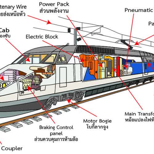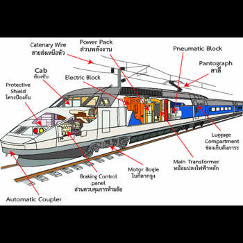 | คำอธิบาย : ซึ่งประกอบไปด้วย Catenary wire (สายส่งเหนือหัว) , Power Pack (ส่วนหลังงาน) , Pneumatic Block Pantograph (สาลี่) , Luggage Compartment (ช่องเก็บสัมภาระ) , Main Transformer (หม้อแปลงไฟฟ้าหลัก) , Motor Bogie (โบกี้ลากจูง) , Braking Control Panel (ส่วนควบคุมการห้ามล้อ) , Automatic Coupler |