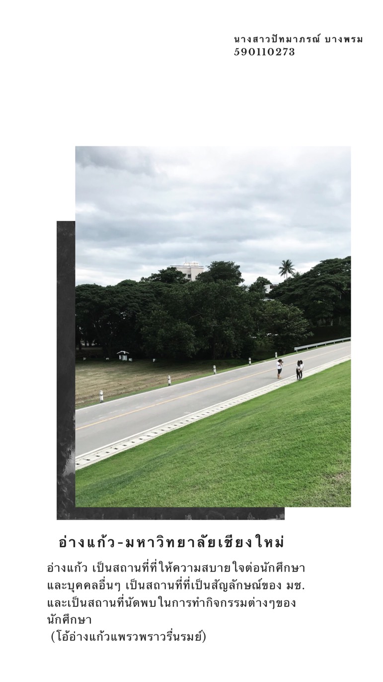 | คำอธิบาย : ผลงานเข้าประกวดภาพถ่าย โครงการ I Love CMU (ฉันรักมหาวิทยาลัยเชียงใหม่) ภายใต้ โครงการประกวดการสร้างสรรค์สื่อประเภทภาพถ่าย ในกลุ่มนักศึกษาภาควิชาบรรณารักษศาสตร์และสารสนศาสตร์ มหาวิทยาลัยเชียงใหม่ โครงการระบบสื่อสาระออนไลน์เพื่อการเรียนรู้ทางไกลเฉลิมพระเกียรติสมเด็จพระเทพรัตนราชสุดาฯ สยามบรมราชกุมารี ในวโรกาสฉลองพระชนมายุ 5 รอบ 2 เมษายน 2558 ภาพถ่าย อ่างแก้ว สื่อถึง สถานที่ที่ให้ความสบายใจต่อนักศึกษาและบุคคลอื่นๆ เป็นสถานที่ที่เป็นสัญลักษณ์ของ มช. และเป็นสถานที่นัดพบในการทำกิจกรรมต่างๆ ของนักศึกษา (โอ้อ่างแก้วแพรวพราวรื่นรมย์) |
