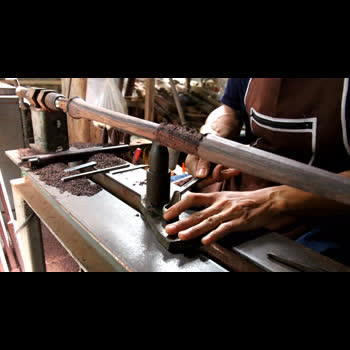 "พิณเปี๊ยะ ขั้นตอนการผลิต การกลึงคันพิณ".