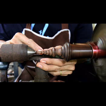 พิณเปี๊ยะ ขั้นตอนการผลิต สร้างลวดลายบนหัวพิณ ได้รับใบอนุญาตภายใต้ ให้เผยแพร่-โดยต้องระบุที่มาแต่ห้ามดัดแปลงและห้ามใช้เพื่อการค้า 3.0 Thailand.