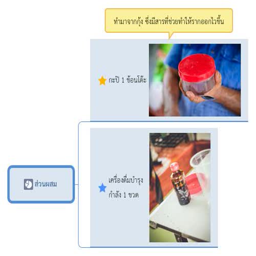 | คำอธิบาย : เป็นแผนที่ความคิดเพื่ออธิบายภาพรวมของสื่อชุด การขยายพันธุ์พืช ตอน การตอนกิ่ง ในส่วนของส่วนผสมของน้ำยาเร่งราก |