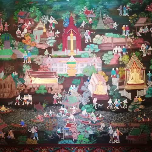 | คำอธิบาย : ภาพจิตรกรรมฝาผนัง ภายในพระอุโบสถวัดท่าสุทธาวาส ที่เขียนโดยนักเรียนและครูของมูลนิธิส่งเสริมศิลปาชีพฯ |