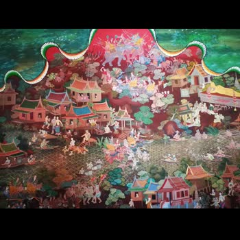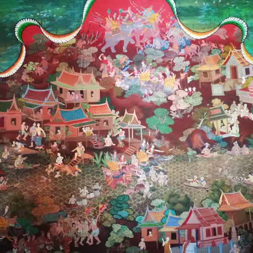 | คำอธิบาย : ภาพจิตรกรรมฝาผนัง ภายในพระอุโบสถวัดท่าสุทธาวาส ที่เขียนโดยนักเรียนและครูของมูลนิธิส่งเสริมศิลปาชีพฯ |