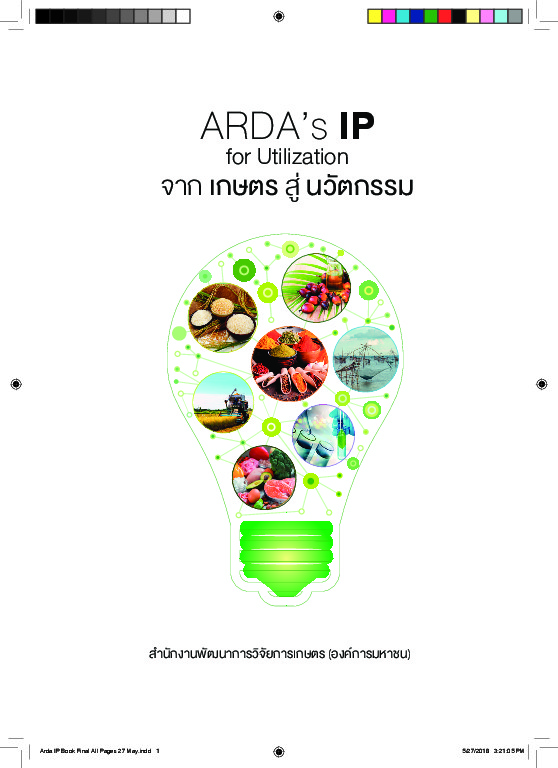 | คำอธิบาย : สำนักงานพัฒนาการวิจัยการเกษตร (องค์การมหาชน) หรือ สวก. ได้ให้ทุนสนับสนุนงานวิจัยแก่หน่วยงานต่างๆ ทั้งภาครัฐและภาคเอกชน เพื่อสร้างผลงานวิจัยที่นำไปสู่การใช้ประโยชน์ในเชิงพาณิชย์ เชิงสาธารณะ และเชิงนโยบาย นอกจากนี้ สวก. ยังตระหนักถึงความสำคัญขององค์ความรู้และเทคโนโลยีที่ได้จากผลงานวิจัย จึงให้ความสำคัญในการบริหารจัดการทรัพย์สินทางปัญญา เพื่อป้องกันการละเมิดลิขสิทธิ์ และคุ้มครองตามกฎหมาย สวก.ได้รวบรวมทรัพย์สินทางปัญญาทั้งหมดของ สวก. ไว้ในหนังสือ ARDA\'s IP for Utilization จากเกษตรสู่นวัตกรรม จำนวน 7 กลุ่มเรื่อง ได้แก่ 1) ข้าว 2) สมุนไพรและเครื่องสำอาง 3) อาหาร 4) ปาล์มน้ำมัน 5) ประมง 6) เครื่องจักร และ 7) เทคโนโลยีชีวภาพ โดยมีเป้าหมายเพื่อเผยแพร่ความรู้และทรัพย์สินทางปัญญาที่เป็นวัตกรรมใหม่ๆ รวมทั้งเป็นอีกช่องทางให้กับผู้ที่สนใจได้เข้าถึงการขอรับอนุญาตให้ใช้สิทธิและเพิ่มโอกาสในการลงทุนทางธุรกิจโดยใช้นวัตกรรมบนฐานการใช้วัตถุดิบทางการเกษตร |