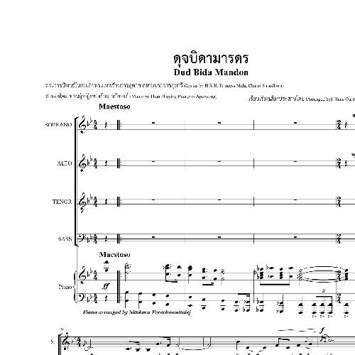 | คำอธิบาย : เพลงพระราชนิพนธ์ ดุจบิดามารดร เป็นเพลงพระราชนิพนธ์ในสมเด็จพระเทพรัตนราชสุดาฯ สยามบรมราชกุมารี ประพันธ์ทำนองโดยท่านผู้หญิงพวงร้อย อภัยวงศ์ ขับร้องโดยสวลี ผกาพันธ์ และสันติ ลุนเผ่ บรรเลงโดยวงดุริยางค์ทหารเรือรูปแบบสำหรับการขับร้องประสานเสียงถูกเรียบเรียงโดย Hans Gunter Mommer และเรียบเรียงเปียโนประกอบโดย นายแพทย์สิทธิกร ปรีชาวุฒิเดช บรรเลง ในมหกรรมการขับร้องประสานเสียงแห่งประเทศไทยปี 2015 ขับร้องครั้งแรกโดย คณะนักร้องประสานเสียงผสมสมาคมขับร้องประสานเสียงแห่งประเทศไทย บรรเลงเปียโนครั้งแรกโดย เมธัส ธรรมลงกรต |