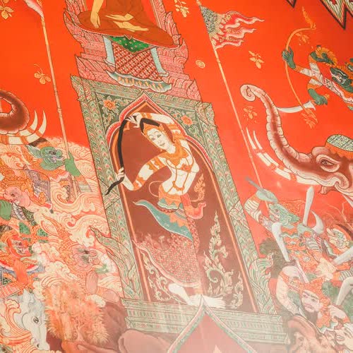 | คำอธิบาย : ภาพจิตรกรรมฝาผนัง ภายในพระอุโบสถวัดท่าสุทธาวาส ที่เขียนโดยนักเรียนและครูของมูลนิธิส่งเสริมศิลปาชีพฯ |