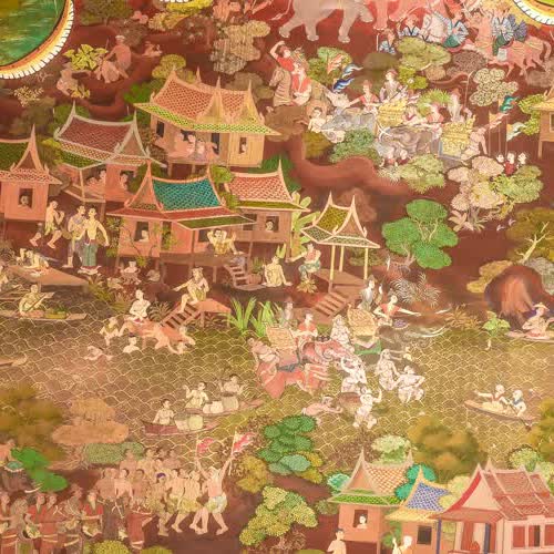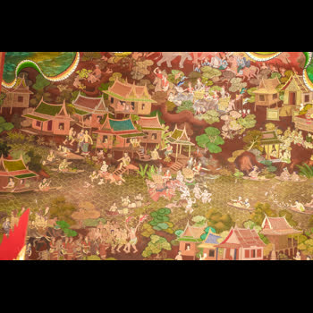 | คำอธิบาย : ภาพจิตรกรรมฝาผนัง ภายในพระอุโบสถวัดท่าสุทธาวาส ที่เขียนโดยนักเรียนและครูของมูลนิธิส่งเสริมศิลปาชีพฯ |
