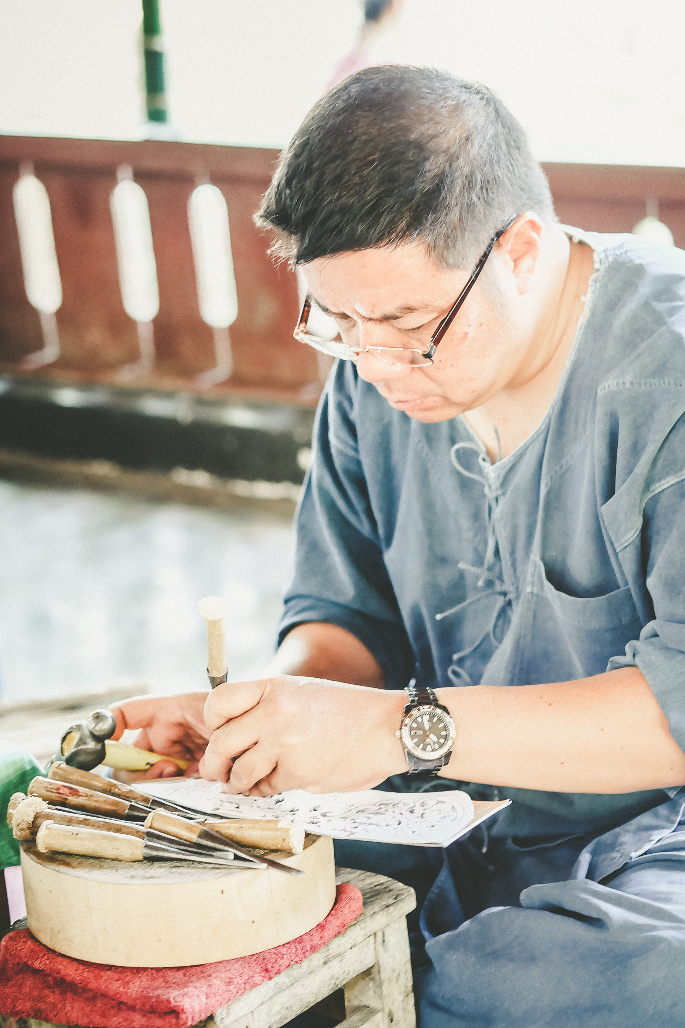 | คำอธิบาย : การสาธิตตอกลายโลหะ ในงาน "กาดสืบสานครัวฮัก" และ "กาดสืบสานงานทำมือ" วันที่ 3-4 พฤศจิกายน 2561 |