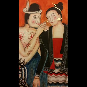 | คำอธิบาย : ปู่ม่านย่าม่าน หรือ หนุ่มกระซิบ เป็นภาพจิตรกรรมฝาผนังภายในวัดภูมินทร์ จังหวัดน่าน อันเป็นผลงานของหนานบัวผัน จิตรกรพื้นถิ่นเชื้อสายไทลื้อ ซึ่งได้รับการยอมรับว่าเป็นผลงานที่ปราณีตและเป็นภาพที่โดดเด่นประจำวัด ภูมินทร์ โดยเป็นภาพชายหญิงคู่หนึ่งกำลังกระซิบสนทนา และมีชื่อเสียงว่าเป็นภาพ กระซิบรักบันลือโลก |
