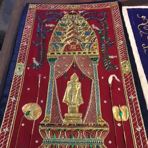 | คำอธิบาย : พระบฏปักไหมคำล้านนา พระบฏ คือผืนผ้าที่มีรูปพระพุทธเจ้าหรือเรื่องราวที่เกี่ยวกับพระพุทธเจ้า เช่นพระพุทธประวัติหรือชาดก คำว่า “บฏ” มีรากศัพท์ในภาษาบาลีว่า ปฏ (ปะ-ตะ) หมายถึงผ้าทอหรือผืนผ้า ทำขึ้นเพื่อสืบทอดพระพุทธศาสนา เพื่อเป็นพุทธบูชาเปรียบเสมือนองค์พระพุทธรูป เพื่ออุทิศส่วนกุศลแด่ผู้ที่ล่วงลับ และเพื่อเป็นอานิสงส์แก่ตนเองและครอบครัว ไหมคำ คือเส้นไหมที่ควบด้วยเส้นสีทองเส้นเล็กๆ เวลาต้องกับแสงจะเกิดประกายแวววาวระยิบระยับ จึงเป็นที่มาของคำว่าไหมคำ ซึ่งถือเป็นวัตถุดิบที่สำคัญต่อการสร้างพระบฏด้วยเทคนิคการปักเนื่องจากให้สีแวววาวงดงามอร่ามตาทรงคุณค่าพระบฏปักไหมคำที่ได้แรงบันดาลใจมาจากพระพิมพ์ดินเผาสมัยลพบุรีหรือศิลปะขอม โดย นายวีรยุทธ ไมตรี จากความชื่นชอบในศิลปะขอมจึงนำมาสู่การสร้างสรรค์เป็นลวดลายปักลงบนผืนผ้ากำมะหยี่สีแดง โดยใช้เส้นไหมคำ เส้นไหมสีสันต่างๆ ผสมผสานกับเลื่อมโลหะ ปีกแมลงทับ และลูกปัดหินสี อาศัยการจัดองค์ประกอบของภาพจากพระพิมพ์ดินเผามาเป็นแนวทางในการจัดองค์ประกอบ คือมีมณฑปปราสาทอยู่กลางผืนผ้า ด้านในปราสาทคือที่ประดิษฐานรูปพระพุทธเจ้า ด้านหลังเป็นลวดลายต้นไม้เดินเส้นด้วยไหมคำและปักปีกแมงทับเป็นใบ และด้านซ้ายขวาขององค์พระมีเครื่องสูงบูชา |