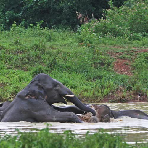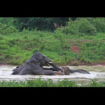 | คำอธิบาย : โขลงช้างป่าเเวะดื่มกินน้ำ เเละลงเล่นน้ำอย่างเพลิดเพลิน |