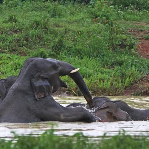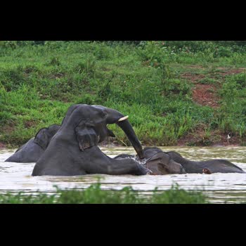 | คำอธิบาย : โขลงช้างป่าเเวะดื่มกินน้ำ เเละลงเล่นน้ำอย่างเพลิดเพลิน |