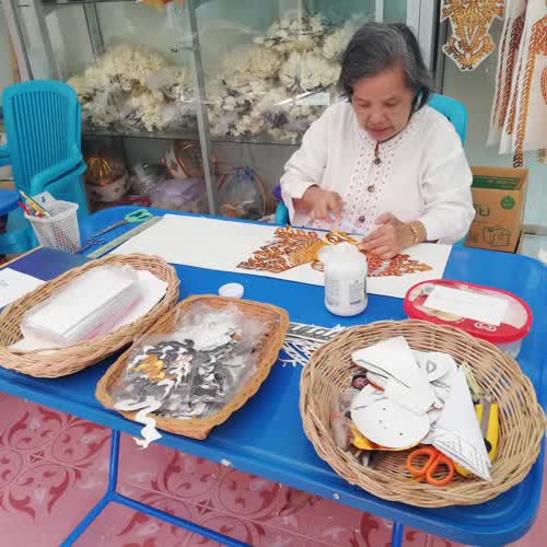 | คำอธิบาย : ในภาพคือการนำลายตุงค่าคิงที่ตอกและกรีดเรียบร้อยแล้วมาติดลงบนกระดาษสา ตุงค่าคิง (ตุง-ก้า-คิง) เป็นภาษาไทใหญ่ ค่า หมายถึง เท่า คิง หมายถึง คนหรือตัว ดังนั้น ตุงค่าคิง จึงหมายถึง ตุงเท่าตัว คือ ตุงที่มีความยาวเท่ากับความสูงของเจ้าของตุง วัตถุประสงค์ในการผลิตตุงค่าคิง คือ เพื่อใช้ประกอบพิธีกรรม สืบชะตา เรียกขวัญ สะเดาะเคราะห์ ต่ออายุ ทั้งเพื่อตนเองหรือเพื่อบรรพบุรุษ ขั้นตอนการทำตุงค่าคิง (เบื้องต้น) ประกอบด้วย 1. เตรียมกระดาษสาเท่ากับความสูงของแต่ละคน 2. เตรียมกระดาษเงิน กระดาษทอง หรือกระดาษสีเพื่อใช้ทำลายประกอบตุง เช่น ลายหัว ลายหาง 3. วางลายส่วนประกอบของตุงลงบนกระดาษเงิน กระดาษทอง หรือกระดาษสีที่เตรียมไว้ 4. ตอกลาย 5. กรีดลาย/ตัดลาย 6. นำลายที่ตอกและกรีดเรียบร้อยแล้วมาติดลงบนกระดาษสา 7. ต่อตัวตุงโดยมีลายปั่นเหน่งเป็นตัวเชื่อม 8. ติดลายจมูก ตา คิ้ว ปาก 9. ติดลายปีนักษัตร และ 10. นำตุงที่ติดลายเสร็จเรียบร้อยแล้วถวายพระ พร้อมกล่าวคำกล่าวในการถวาย |