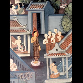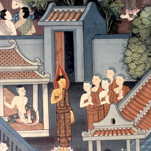 | คำอธิบาย : จิตรกรรมฝาผนังอายุเกือบ ๒๐๐ ปี สะท้อนวิถีชีวิตชาวสยาม ความศรัทธาในพระพุทธศาสนา อารยธรรมที่ผสานศิลปะแบบจีน ซึ่งเป็นเอกลักษณ์ ของจิตรกรรมสมัยพระบาทสมเด็จพระนั่งเกล้าเจ้าอยู่หัว ในพระวิหารพระพุทธไสยาสน์ที่งดงาม |