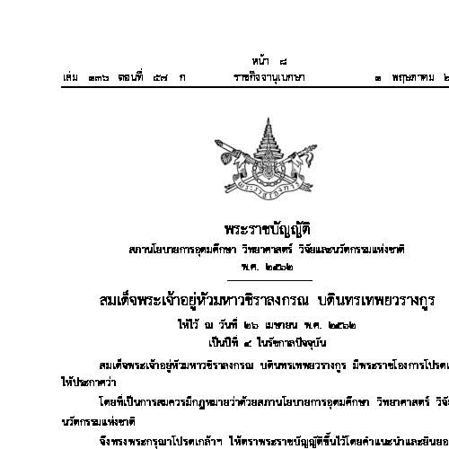 | คำสำคัญ : สภานโยบายการอุดมศึกษา, วิจัยและนวัตกรรมแห่งชาติ พ.ศ. 2562, วิทยาศาสตร์, พระราชบัญญัติ, ratchakitcha |