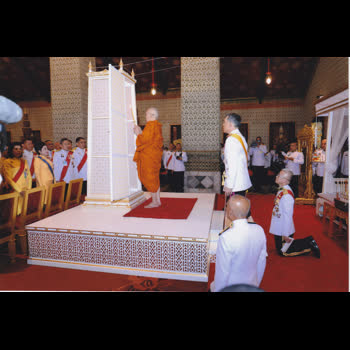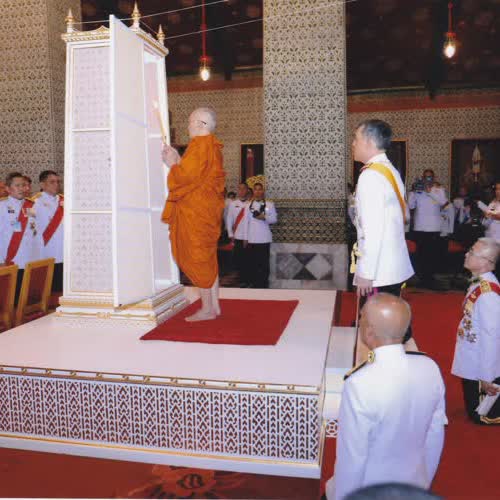 คำอธิบาย : ภาพพระราชทาน วันศุกร์ที่ 3 พฤษภาคม 2562 เชิญพระสุพรรณบัฏ ดวงพระบรมราชสมภพ และพระราชลัญจกรไปยังพระที่นั่งไพศาลทักษิณ เสด็จพระราชดำเนินไปทรงนมัสการพระพุทธมหามณีรัตนปฏิมากร พระรัตนตรัย และถวายบังคมพระบรมอัฐิและพระอัฐิ จุดเทียนชัย พระสงฆ์ทรงสมาณศักดิ์ประกาศการพระราชพิธีบรมราชาภิเษก His Majesty the King proceeds to pay homage to the Emerald Buddha and the ashes of royal ancestors. Then His Majesty lights the ceremonial candles and a senior monk announces the coronation ceremony. |