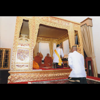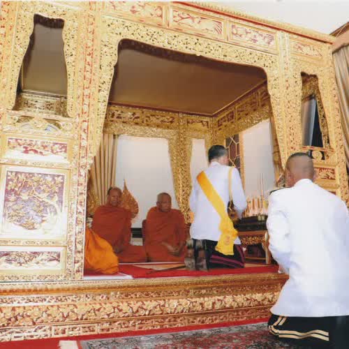 คำอธิบาย : ภาพพระราชทาน วันศุกร์ที่ 3 พฤษภาคม 2562 เชิญพระสุพรรณบัฏ ดวงพระบรมราชสมภพ และพระราชลัญจกรไปยังพระที่นั่งไพศาลทักษิณ เสด็จพระราชดำเนินไปทรงนมัสการพระพุทธมหามณีรัตนปฏิมากร พระรัตนตรัย และถวายบังคมพระบรมอัฐิและพระอัฐิ จุดเทียนชัย พระสงฆ์ทรงสมาณศักดิ์ประกาศการพระราชพิธีบรมราชาภิเษก His Majesty the King proceeds to pay homage to the Emerald Buddha and the ashes of royal ancestors. Then His Majesty lights the ceremonial candles and a senior monk announces the coronation ceremony. |