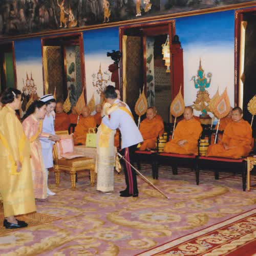 | คำอธิบาย : ภาพพระราชทาน วันศุกร์ที่ 3 พฤษภาคม 2562 เชิญพระสุพรรณบัฏ ดวงพระบรมราชสมภพ และพระราชลัญจกรไปยังพระที่นั่งไพศาลทักษิณ เสด็จพระราชดำเนินไปทรงนมัสการพระพุทธมหามณีรัตนปฏิมากร พระรัตนตรัย และถวายบังคมพระบรมอัฐิและพระอัฐิ จุดเทียนชัย พระสงฆ์ทรงสมาณศักดิ์ประกาศการพระราชพิธีบรมราชาภิเษก His Majesty the King proceeds to pay homage to the Emerald Buddha and the ashes of royal ancestors. Then His Majesty lights the ceremonial candles and a senior monk announces the coronation ceremony. |