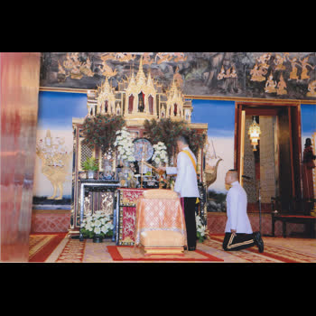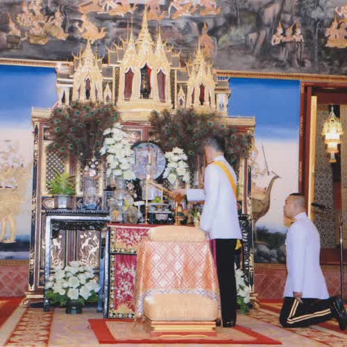 คำอธิบาย : ภาพพระราชทาน วันศุกร์ที่ 3 พฤษภาคม 2562 เชิญพระสุพรรณบัฏ ดวงพระบรมราชสมภพ และพระราชลัญจกรไปยังพระที่นั่งไพศาลทักษิณ เสด็จพระราชดำเนินไปทรงนมัสการพระพุทธมหามณีรัตนปฏิมากร พระรัตนตรัย และถวายบังคมพระบรมอัฐิและพระอัฐิ จุดเทียนชัย พระสงฆ์ทรงสมาณศักดิ์ประกาศการพระราชพิธีบรมราชาภิเษก His Majesty the King proceeds to pay homage to the Emerald Buddha and the ashes of royal ancestors. Then His Majesty lights the ceremonial candles and a senior monk announces the coronation ceremony. |