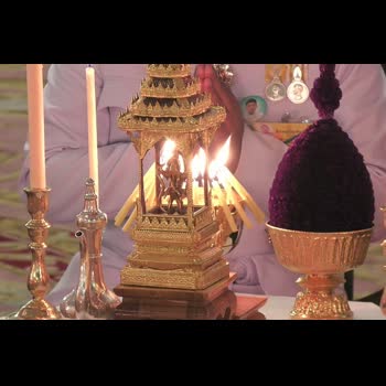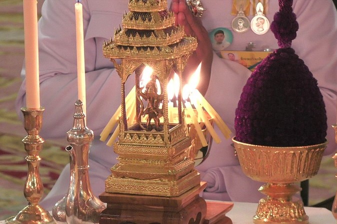 | คำอธิบาย : ภาพพระราชทาน วันศุกร์ที่ 3 พฤษภาคม 2562 เชิญพระสุพรรณบัฏ ดวงพระบรมราชสมภพ และพระราชลัญจกรไปยังพระที่นั่งไพศาลทักษิณ เสด็จพระราชดำเนินไปทรงนมัสการพระพุทธมหามณีรัตนปฏิมากร พระรัตนตรัย และถวายบังคมพระบรมอัฐิและพระอัฐิ จุดเทียนชัย พระสงฆ์ทรงสมาณศักดิ์ประกาศการพระราชพิธีบรมราชาภิเษก His Majesty the King proceeds to pay homage to the Emerald Buddha and the ashes of royal ancestors. Then His Majesty lights the ceremonial candles and a senior monk announces the coronation ceremony. |