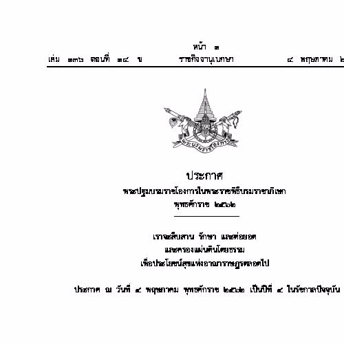| ชื่อเรื่อง : พระบรมราชโองการ ประกาศ พระปฐมบรมราชโองการในพระราชพิธีบรมราชาภิเษก พุทธศักราช ๒๕๖๒ |